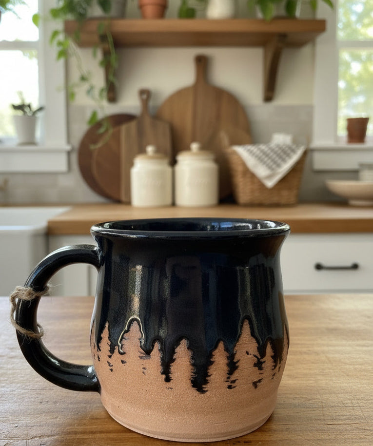 This handcrafted ceramic mug features a tree-line shadow glaze design that mimics a natural landscape.